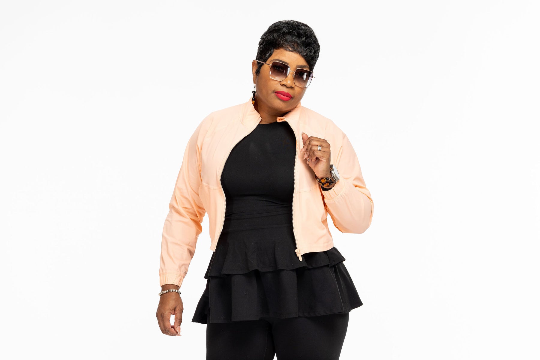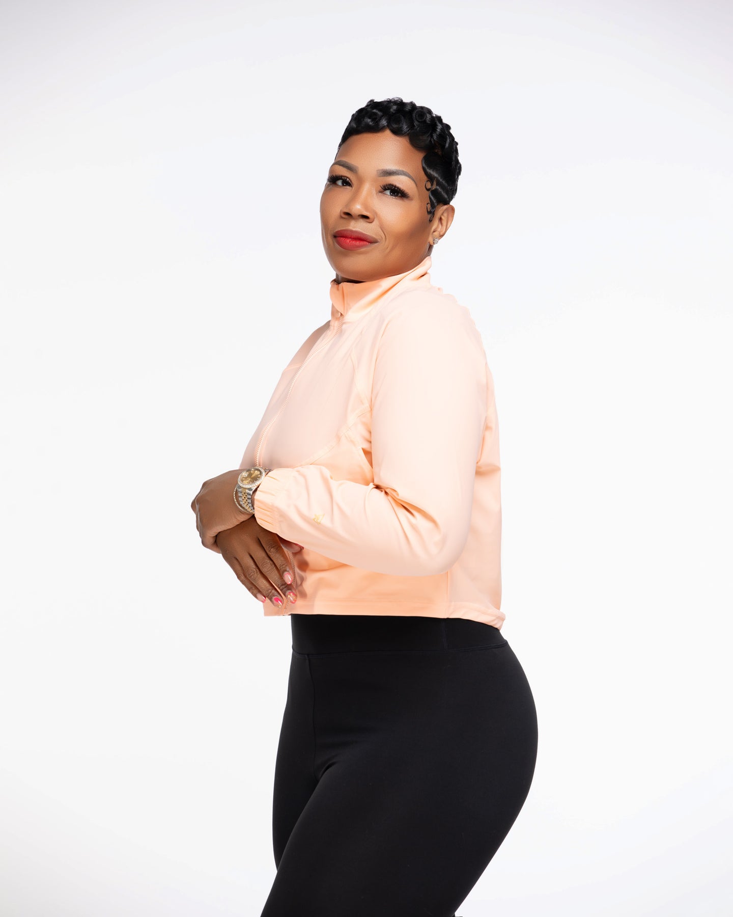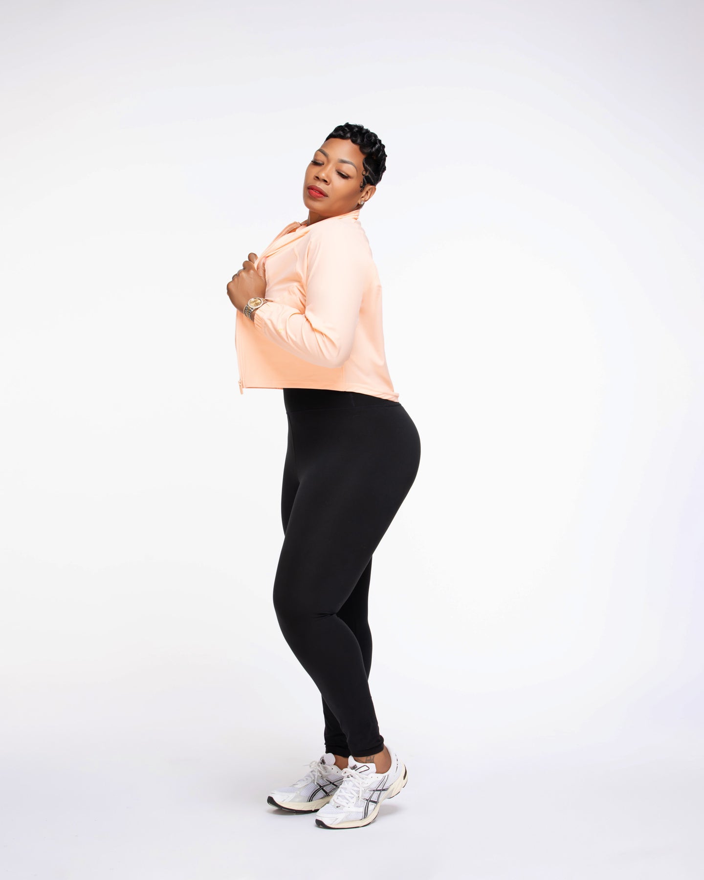 Stylish woman wearing a Pooh Wear Work to Workout athletic outfit with Pooh Wear Work jacket.